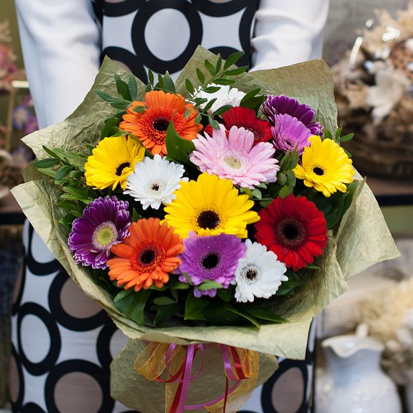 Букет из минигербер с декоративной зеленью в подарочной упаковке.