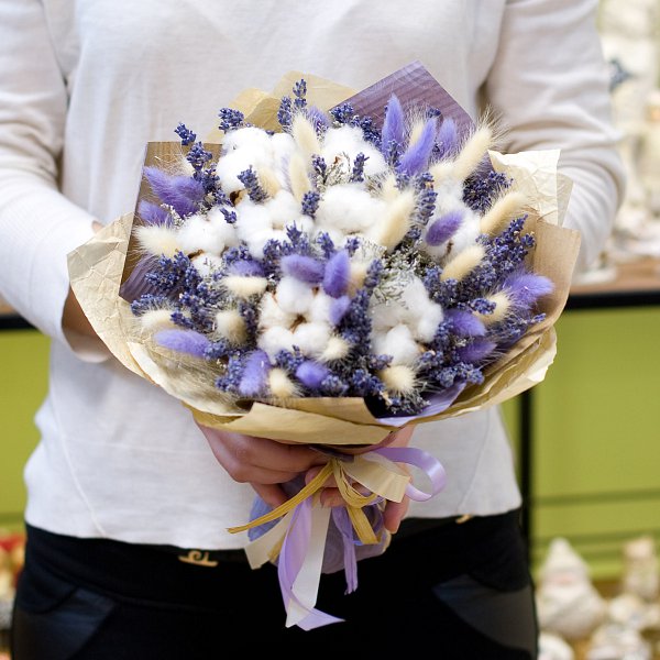Букет из сухоцветов: лагурусов, лаванды, лимониума, хлопка, - в подарочной упаковке.