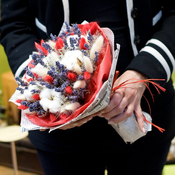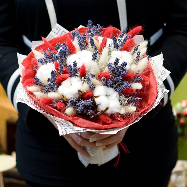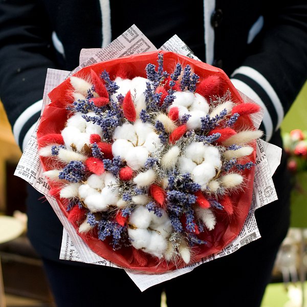 Букет из сухоцветов: хлопка, лагурусов, лимониума, лаванды, -с бумагой тишью и крафтом.