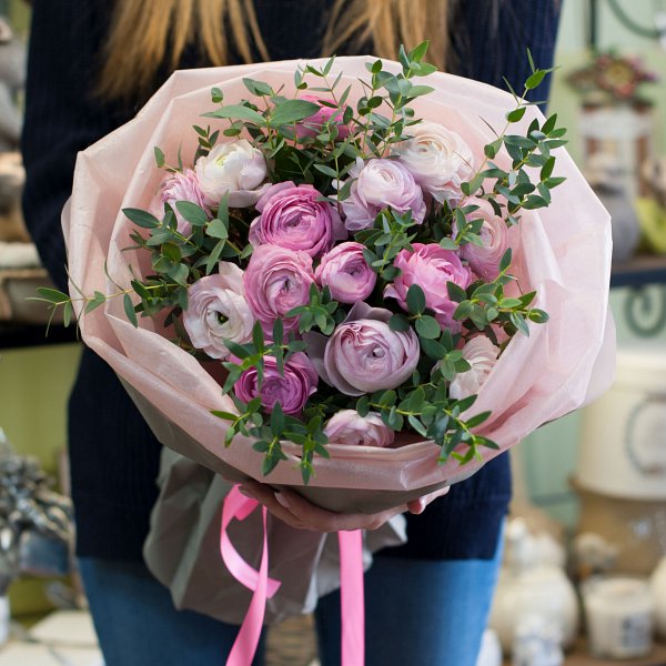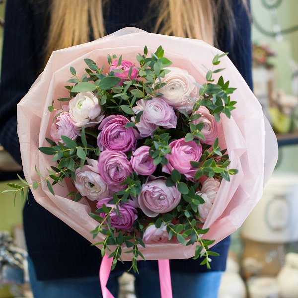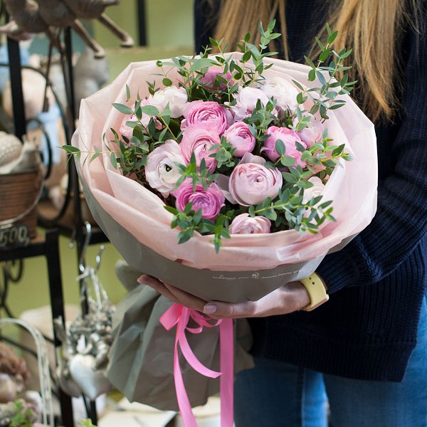Букет из розовых ранункулусов с эвкалиптом в подарочной упаковке.