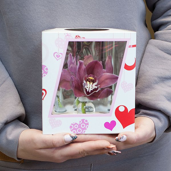 Орхидея цимбидиум в подарочной коробочке розового цвета.