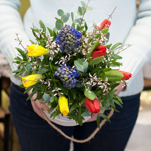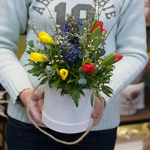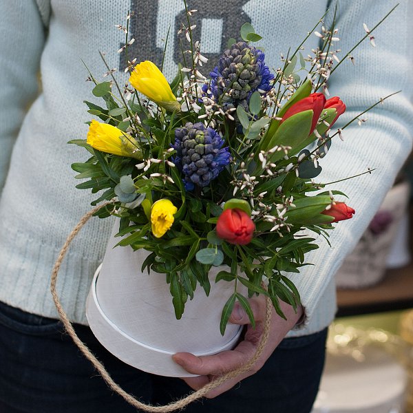 Коробка с весенними цветами (гиацинтами, нарциссами, тюльпанами) с декоративной зеленью для корпоративных подарков.