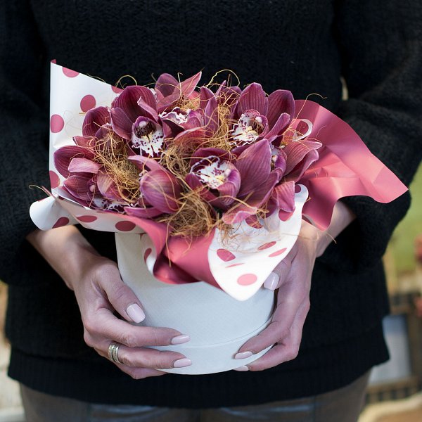 Шляпная коробка из 9-ти орхидей цимбидиум.
