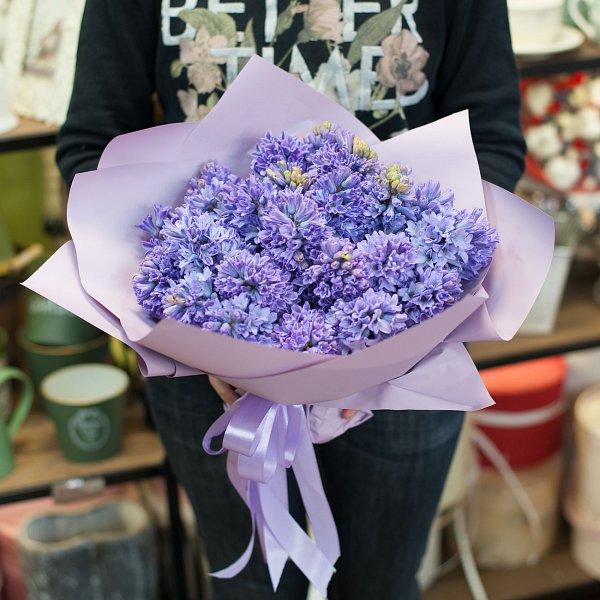 Букет из 25-ти сиреневых гиацинтов в дизайнерской пленке.