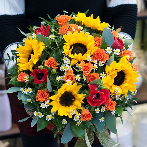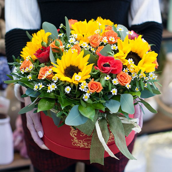 Коробка в ярких тонах из подсолнухов, анемонов, кустовых роз, ромашек с декоративной зелень.