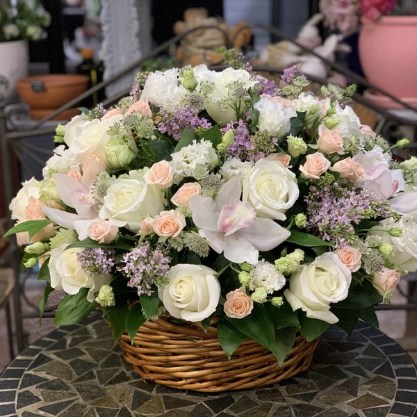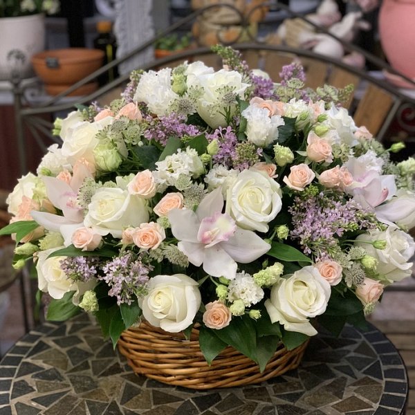 Корзина в нежных тонах из роз, сирени, орхидей, эустом и астранции