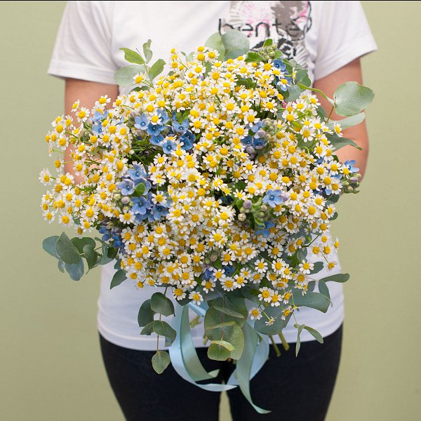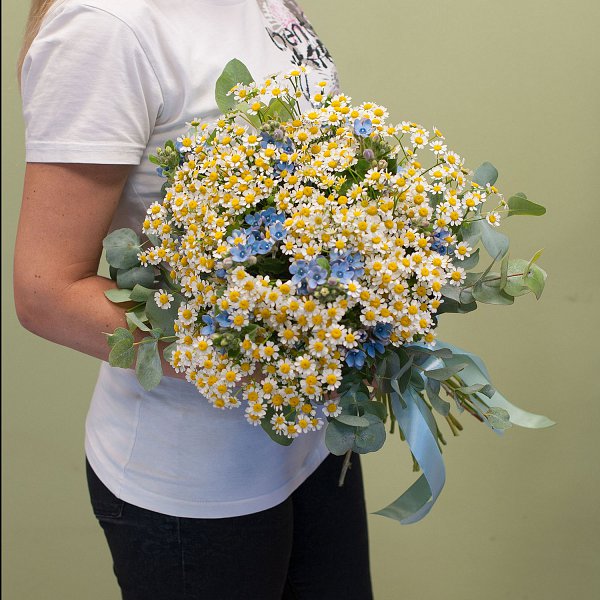 Букет цветов "Ромашки-незабудки" подойдет для подарка маме, коллеге или женщине.
