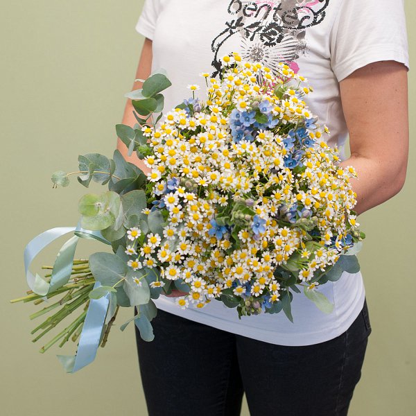 Букет цветов "Ромашки-незабудки" - это уникальное сочетание полевых ромашек и оксипеталума с эвкалиптом. Этот стильный и яркий букет станет отличным подарком для любого повода, будь то День семьи, день рождения или рождение ребенка.