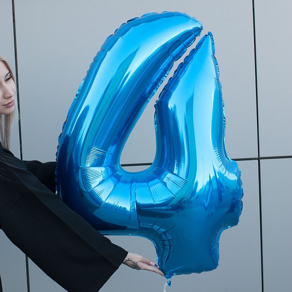 Воздушный шар выполнен в форме цифры "4" и имеет голубой/синий цвет. Матовый оттенок придает шару изысканный и элегантный вид. Однотонный принт делает его привлекательным и запоминающимся.