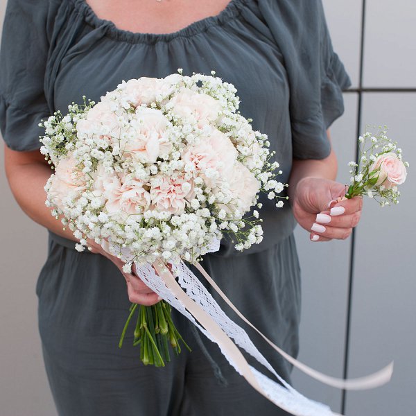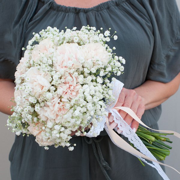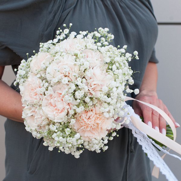 Букет состоит из 24 гвоздик и 9 гипсофил, что делает его пышным и объемным. Белые цветы придают образу невесты воздушность и легкость.