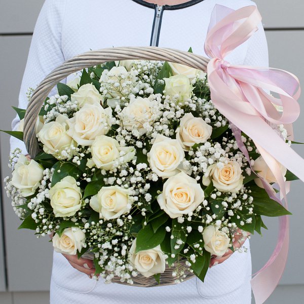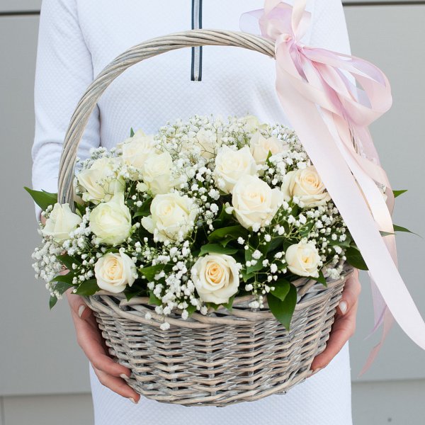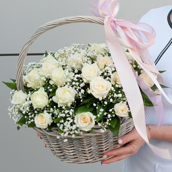 Корзина с розами "Белые облака" может стать отличным подарком на любой праздник, будь то день рождения, день свадьбы, день семьи, день учителя, Пасха, Рождество или юбилей.