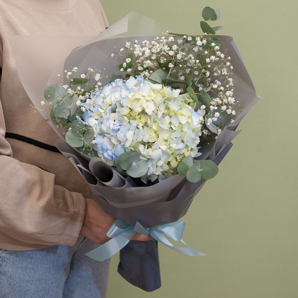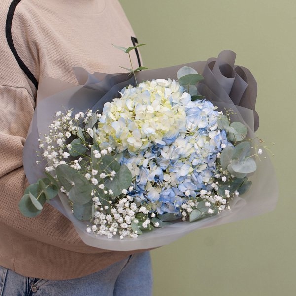 Букет из голубой гортензии, белой гипсофилы с эвкалиптом в подарочной упаковке.