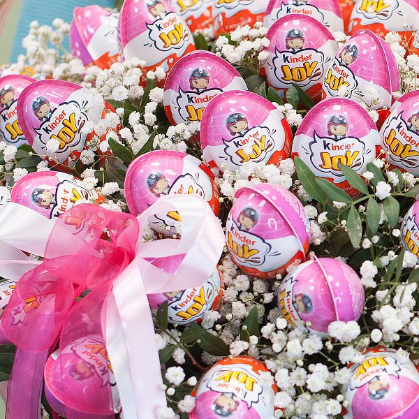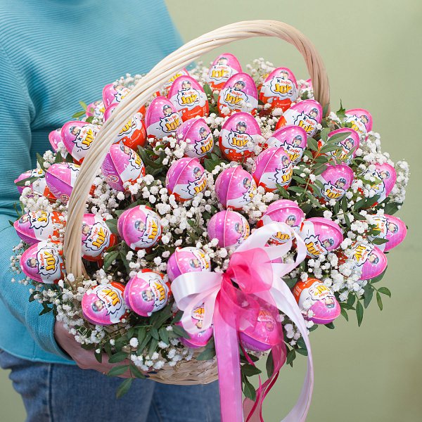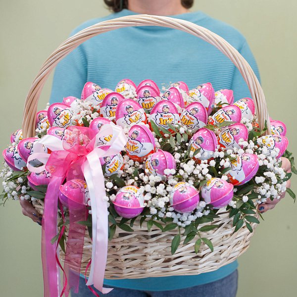 Подарочная корзина из шоколадных яиц серии "Киндер Joy" с гипсофилой и зеленью.