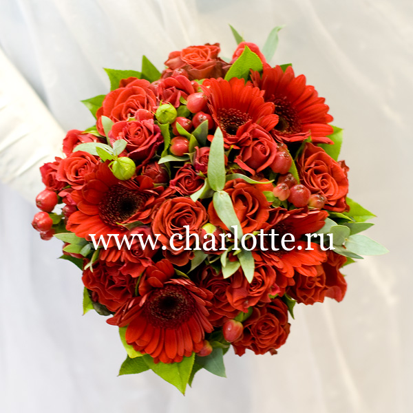 Букет невесты в красных тонах из минигербер, розы "Эль Торро", гиперикума, красной кустовой розы, зелень, лента. По Вашему желанию цветовую гамму буета можно изменить, для этого звоните нашим операторам по телефону или указывайте в разделе "комментарии для флориста" при заказе через интернет.