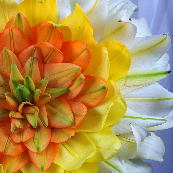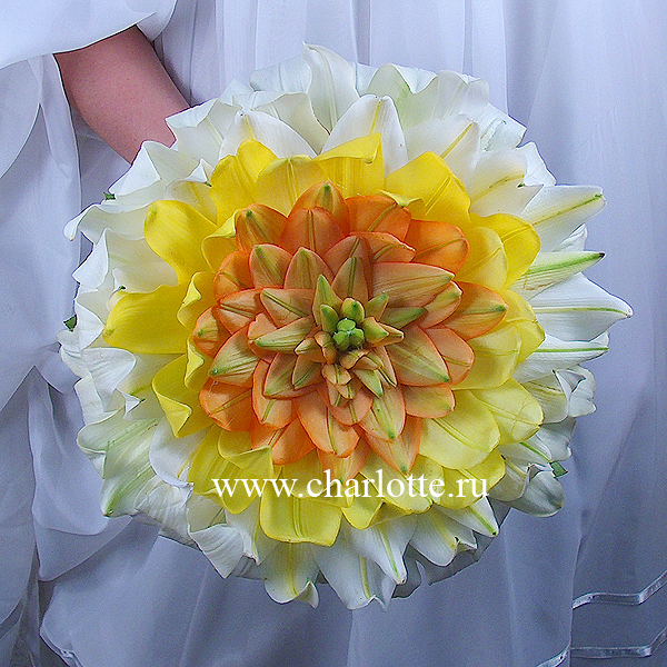 Букет сделан из лепестков лилий желтого, оранжевого и белого цвета.
