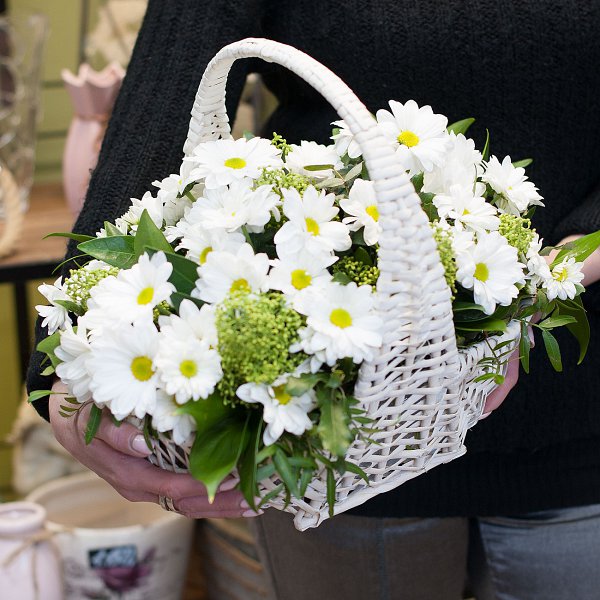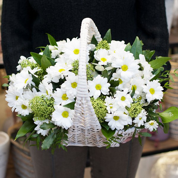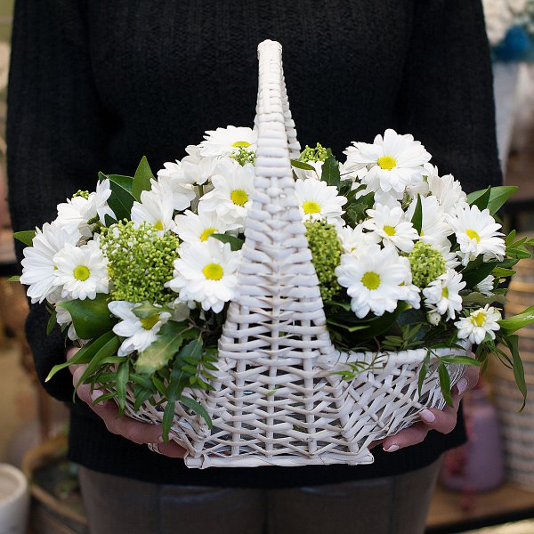 Корзина из ромашковой хризантемы со скимией и зеленью.