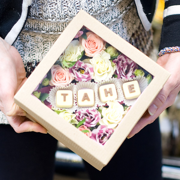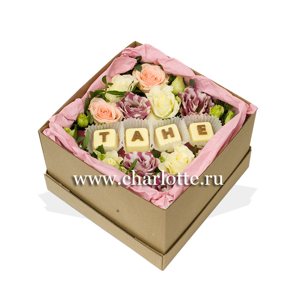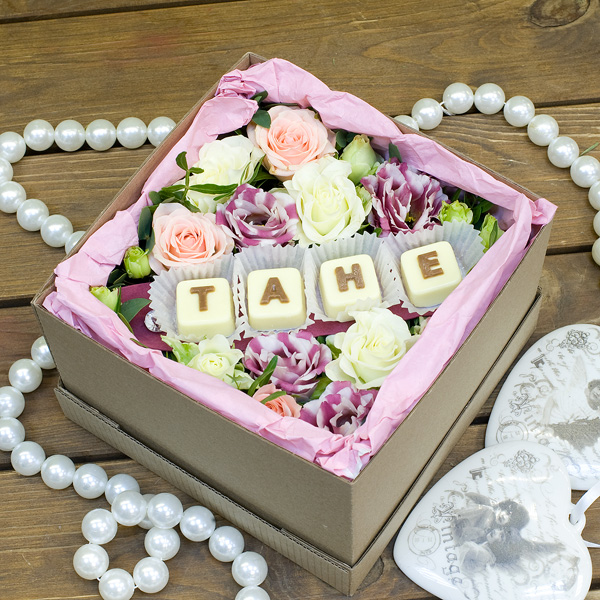 Коробка с живыми цветами и шоколадом "Тане"