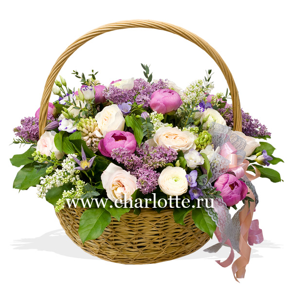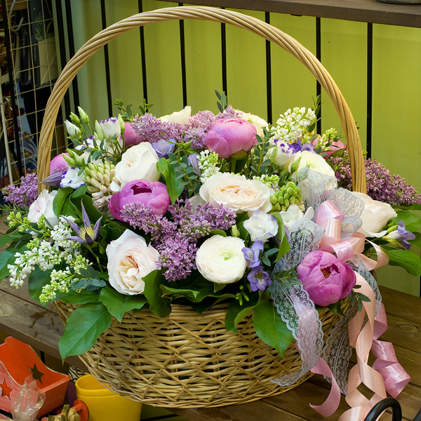 Корзина в нежных тонах из элитных роз сорта Девида Остина, пионов, ранункулусов, сирени (белой и сиреневой), гиацинтов, клематисов, лизиантусов, фрезий с декоративной зеленью. По Вашему желанию цветовую гамму композиции можно изменить, для этого звоните в наши салоны цветов или указывайте в разделе "комментарии для флориста" при заказе через интернет.