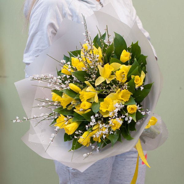Букет из желтых нарциссов с белой генистой, зеленью в дизайнерской бумаге.