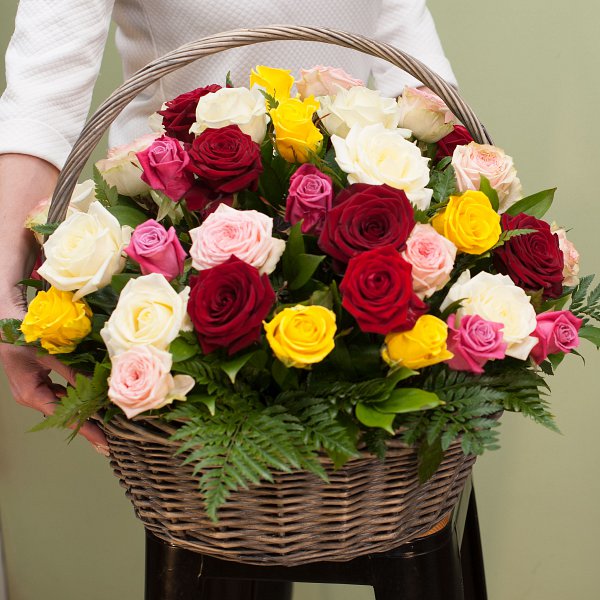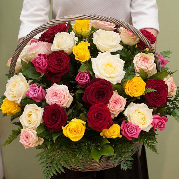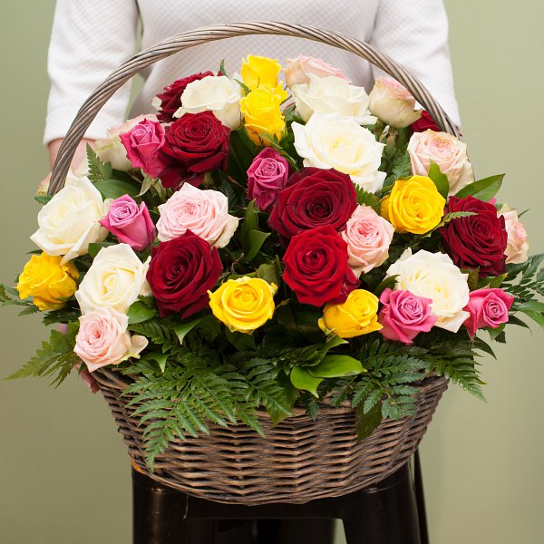 Корзина из разноцветных роз с зеленью в корозине.