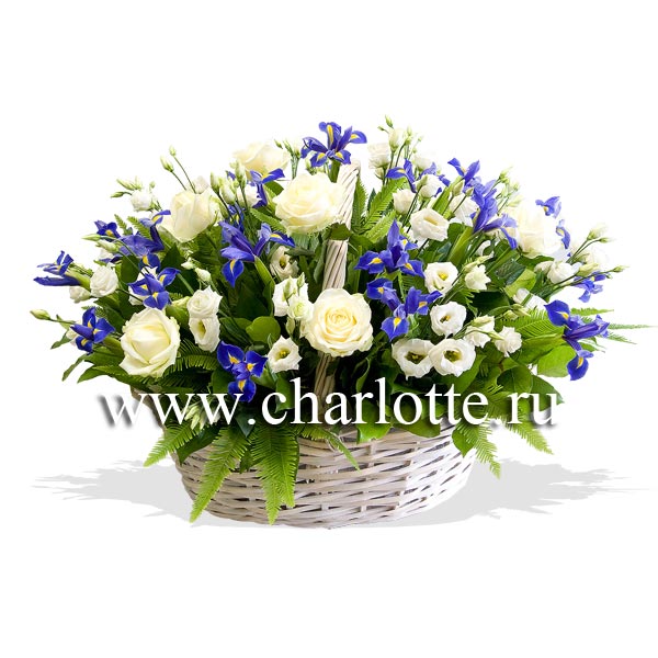 Корзина в сине-белых тонах из белых роз, лизиантусов и ирисов. По Вашему желанию цветовую гамму корзины можно изменить, для этого звоните в наши салоны цветов или указывайте в разделе "комментарии для флориста" при заказе через интернет.