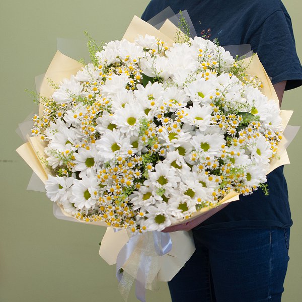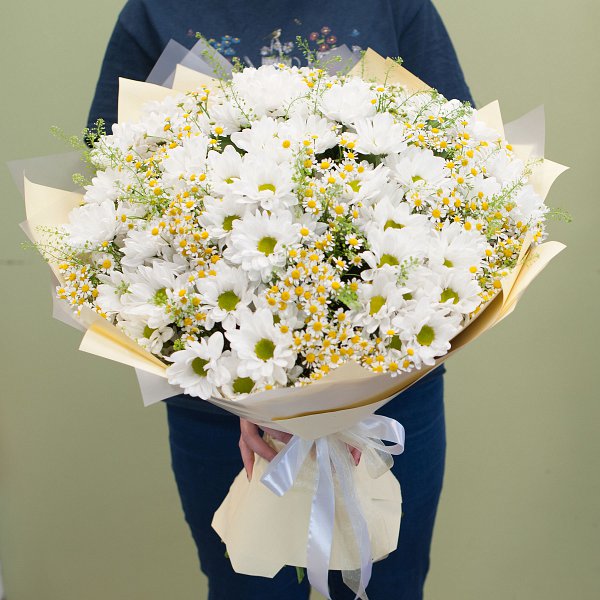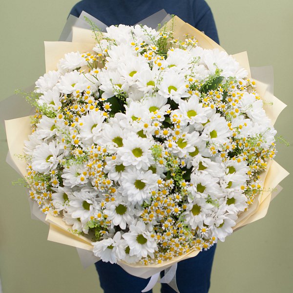 Букет выполнен в белой гамме, что придает ему особую нежность и воздушность. В составе букета вы найдете 41 белую ромашковую хризантему, ромашку и грин белл с декоративной зеленью. Такой состав цветов создает гармоничную композицию, которая будет радовать глаз и вызывать приятные эмоции.