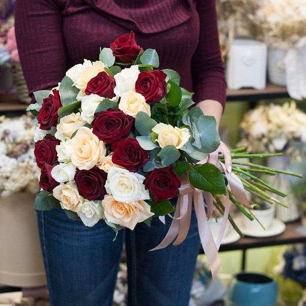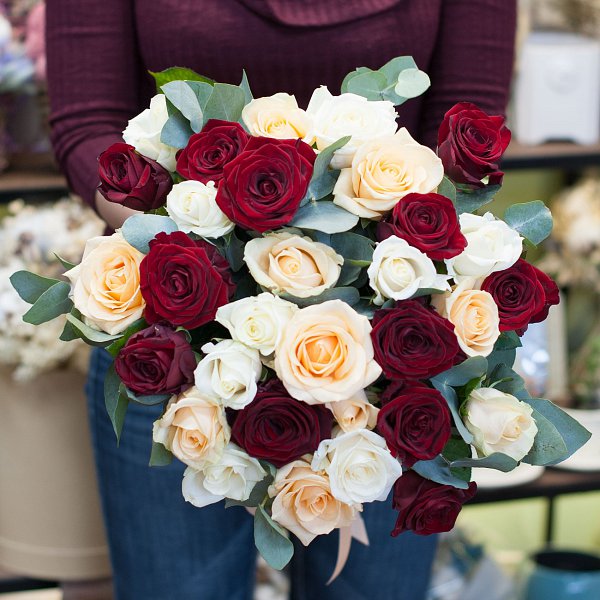 Букет из красных, белых, персиковых роз с декоративной зеленью-эвкалиптом.
