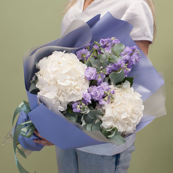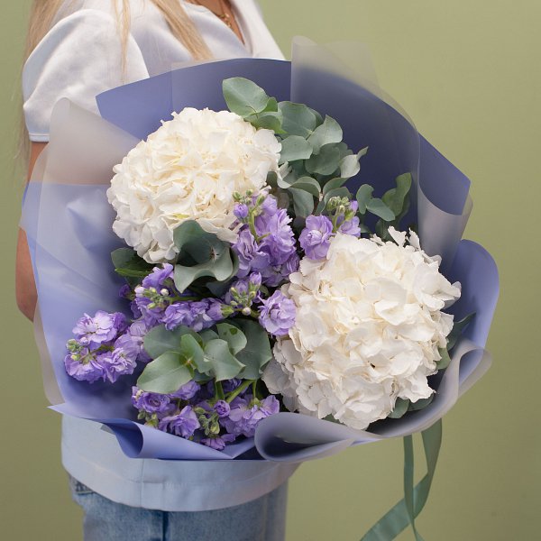 Букет из белой гортензии, лавандовой кустовой матиоллы с эвкалиптом в подарочной упаковке.