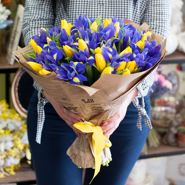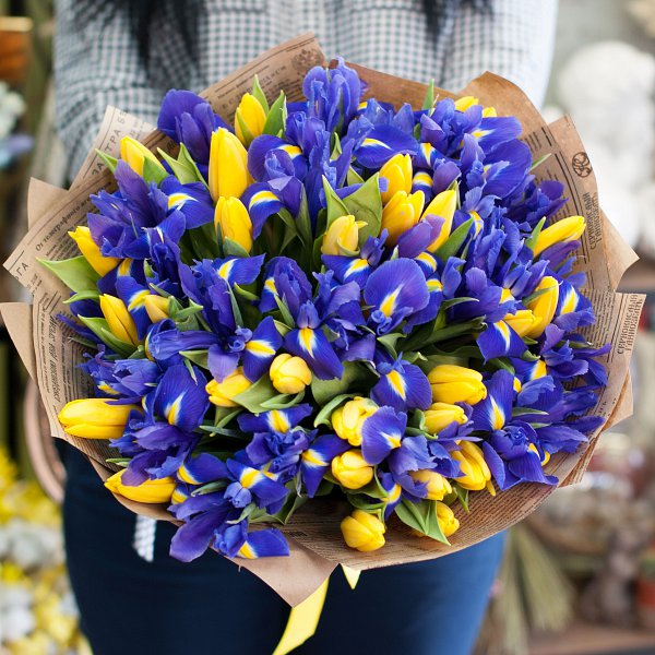 Букет цветов "Сияющий" - это уникальное сочетание желтых тюльпанов и синих ирисов, создающее неповторимую атмосферу радости и счастья.