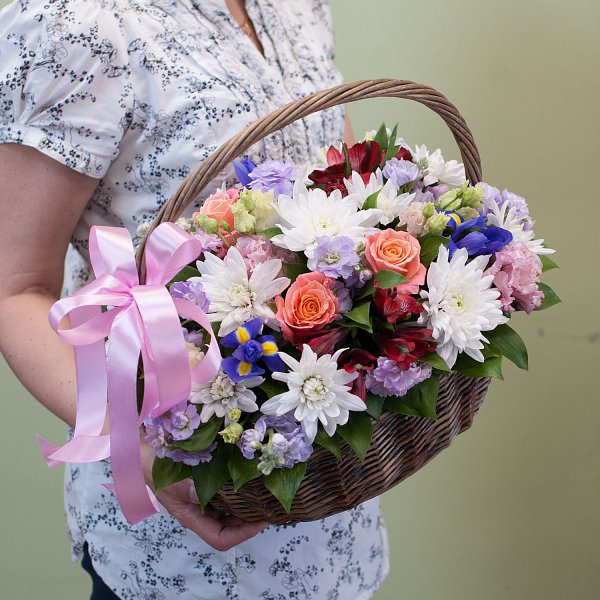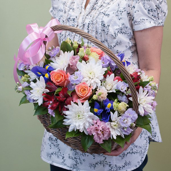 Цветы, входящие в состав корзины, подобраны с особой тщательностью. Это могут быть розы, хризантемы, гвоздики, тюльпаны и другие виды цветов. Их сочетание создает неповторимую композицию, которая будет радовать глаз и поднимать настроение.