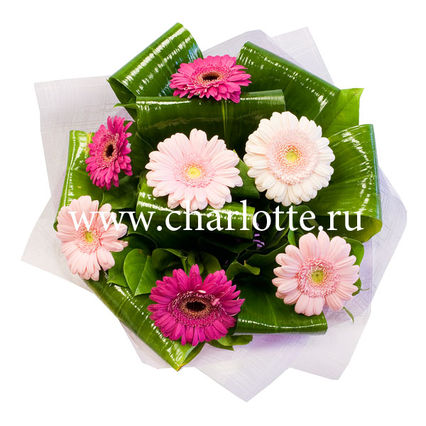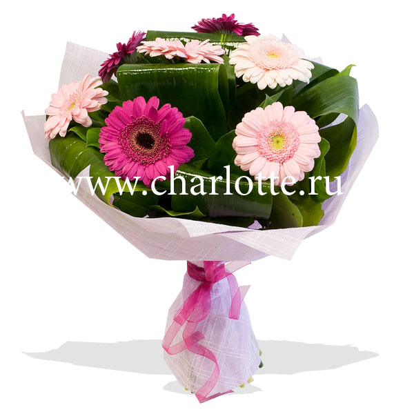 Букет в розовых тонах из гербер и декоративной зеленью. Цветы оформляются в подарочную упаковку на усмотрение нашего флориста. Если Вы хотите изменить тона букета, звоните в наши салоны цветов или указывайте в разделе "комментарии для флориста" при заказе через интернет.