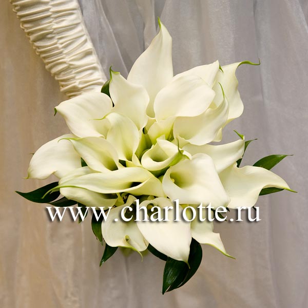 Букет невесты из белых калл и итальянского рускуса. По Вашему желанию цветовую гамму букета можно изменить, для этого звоните в наши салоны цветов или указывайте в разделе "комментарии для флориста" при заказе через интернет.