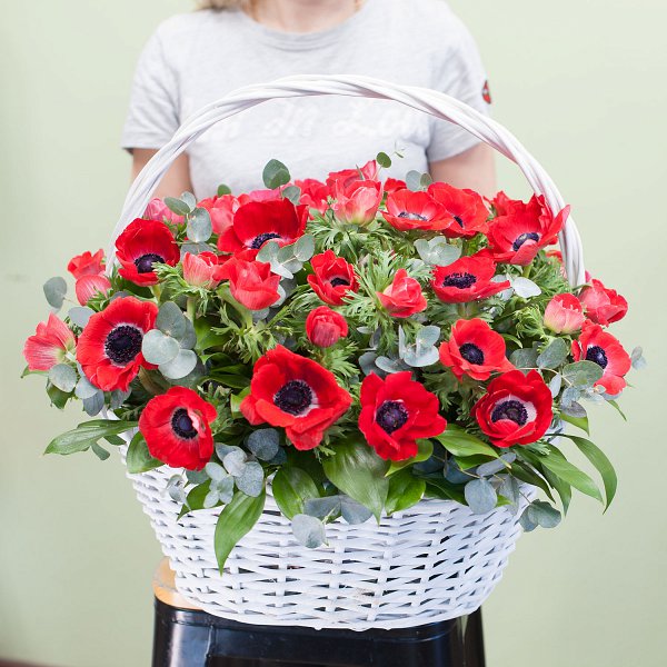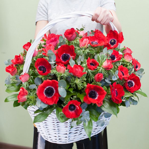 Корзина из красных анемонов с эвкалиптом и зеленью.