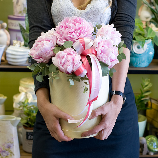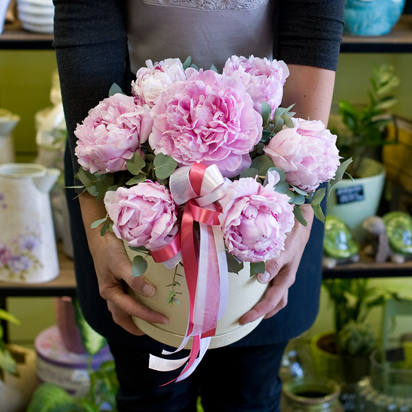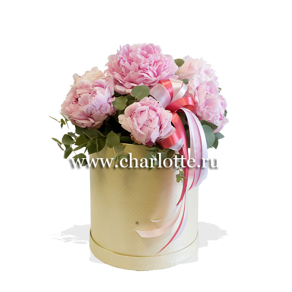 Композиция в шляпной коробке в розовых тонах из пионов сорта "Сара Бернар". По Вашему желани. цветовую гамму композиции можно изменить, для этого звоните в наши салоны цветов или указывайте в разделе "комментарии для флориста" при заказе через интернет.