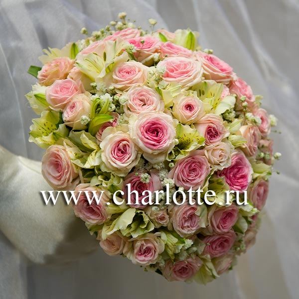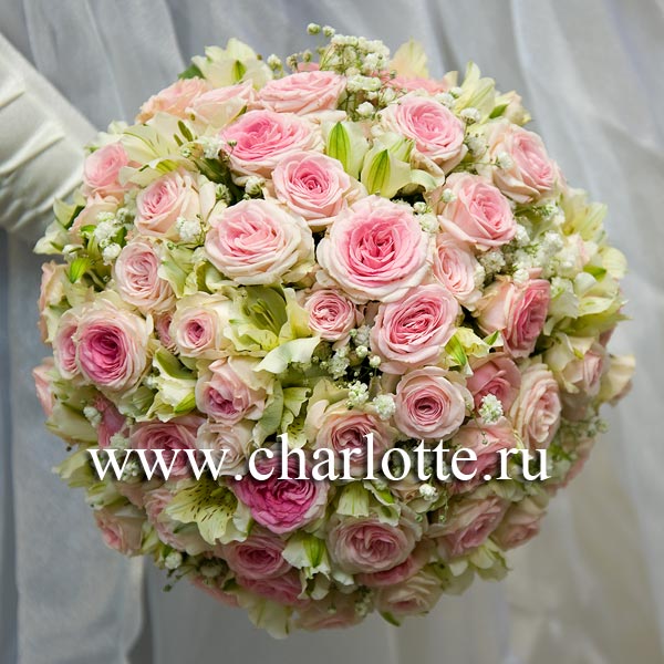 Букет невесты в бело-розовых тонах классической формы.По Вашему желанию цветовую гамму букета можно изменить, для этого звоните в наши салоны цветов или указывайте в разделе "комментарии для флориста" при заказе через интернет.