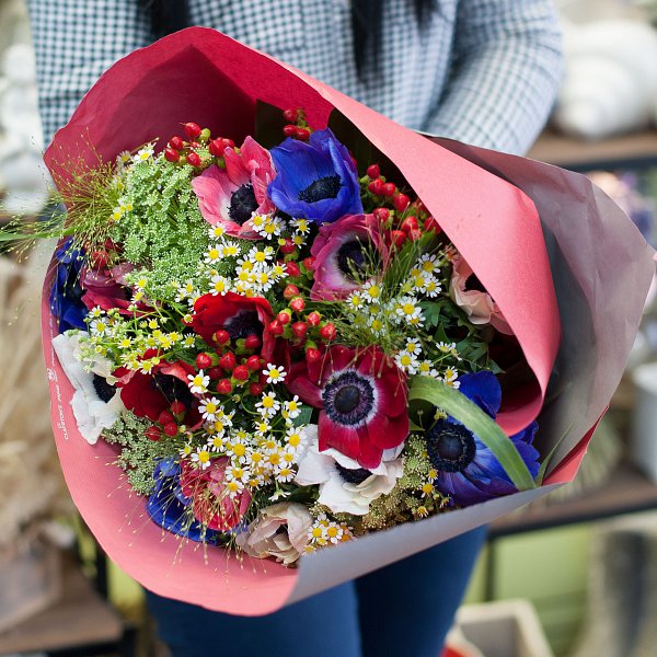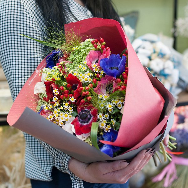 Букет состоит из красных и синих анемонов, которые символизируют любовь и страсть. Ромашки и гиперикум добавляют нежности и теплоты, а паникум с декоративной зеленью создают ощущение свежести и легкости.