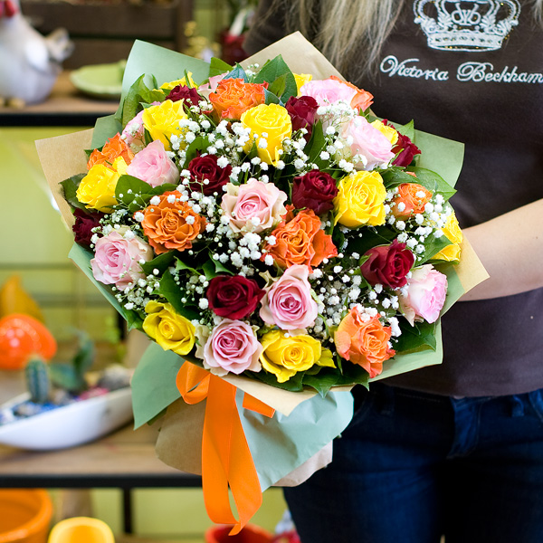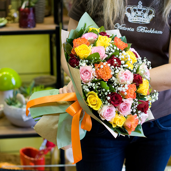 Букет из разноцветных некрупных роз с декоративной зеленью и гипсофилой в подарочной упаковке. По Вашему желанию цветовую гамму букета можно изменить, для этого звоните в наши салоны цветов или указывайте в разделе "комментарии для флориста" при заказе через интернет.