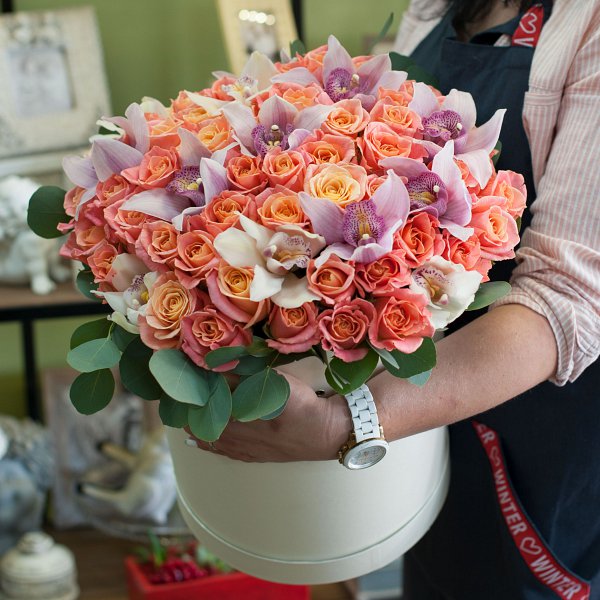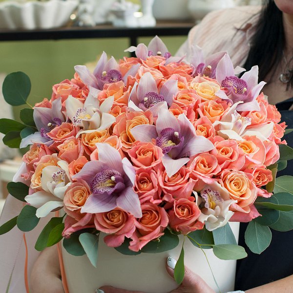 Коробка из персиковых роз сорта "Мисс пиги", белых и розовых орхидей с декоративной зеленью.