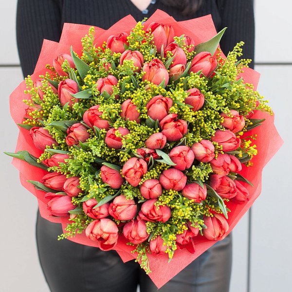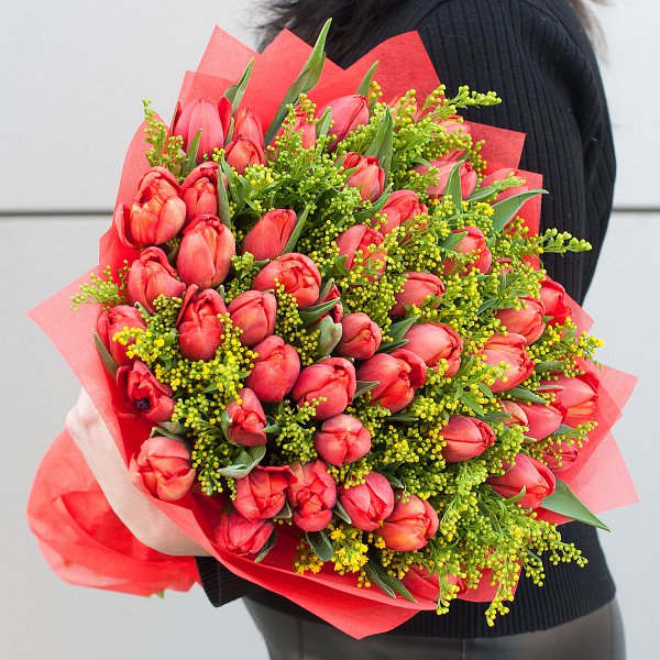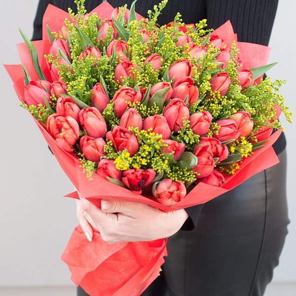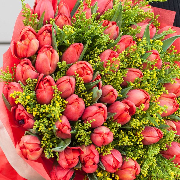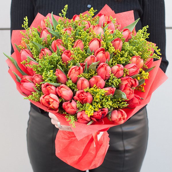 Букет "Весеннее солнце" - это сборный букет, состоящий из 64 красных тюльпанов и 15 желтых солидаго.