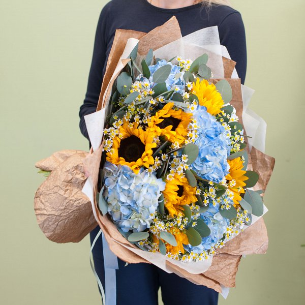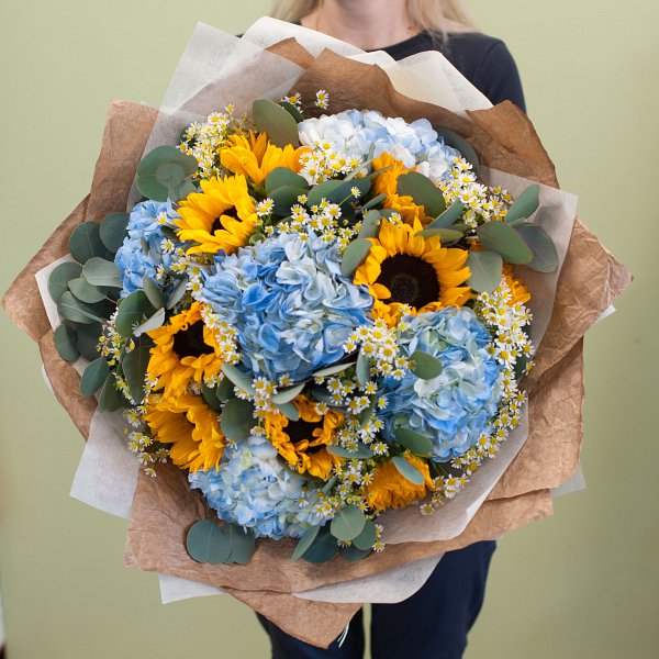 Букет состоит из 37 цветов, включая подсолнухи, ромашки и гортензии. Это создает уникальную и насыщенную композицию, которая будет радовать глаз и поднимать настроение.