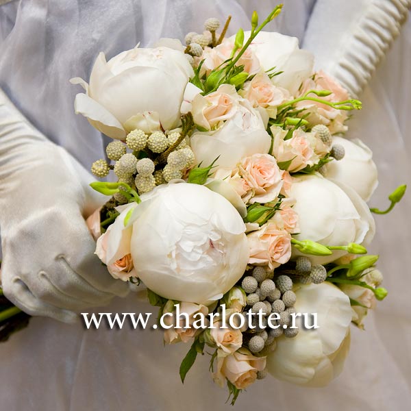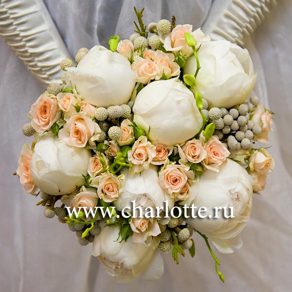 Букет невесты из белых пионов, кремовых роз, серебристой брунии, орхидей дендробиум. По Вашему желанию цветовую гамму букета можно изменить, для этого звоните в наши салоны цветов или указывайте в разделе "комментарии для флориста" при заказе через интернет.