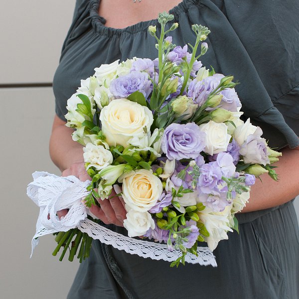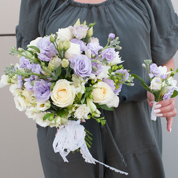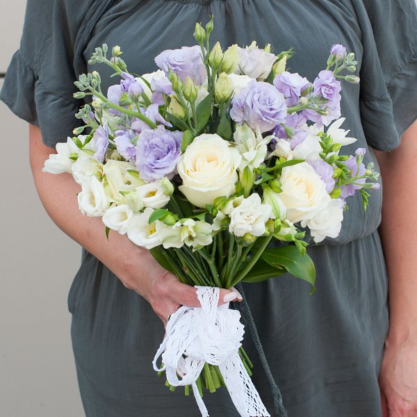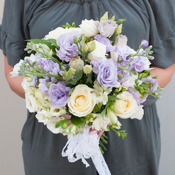 Букет выполнен в бело-лавандовых тонах, что придает ему особую изысканность и нежность. В составе букета используются такие цветы, как маттиола, лизиантус, роза кустовая, альстромерия, фрезия.