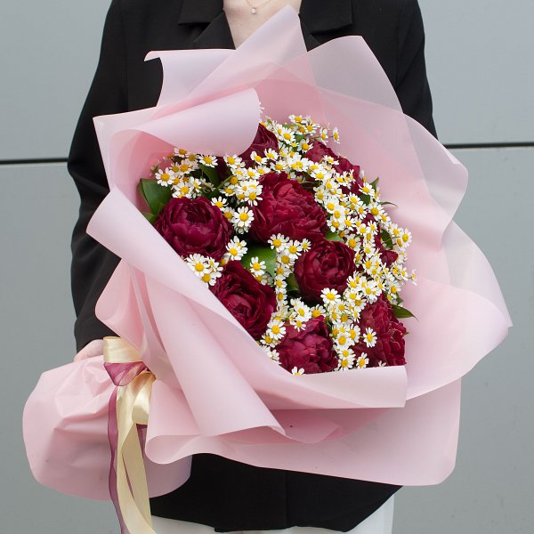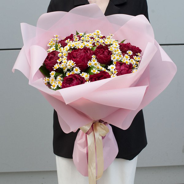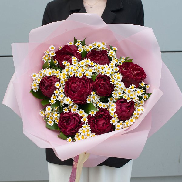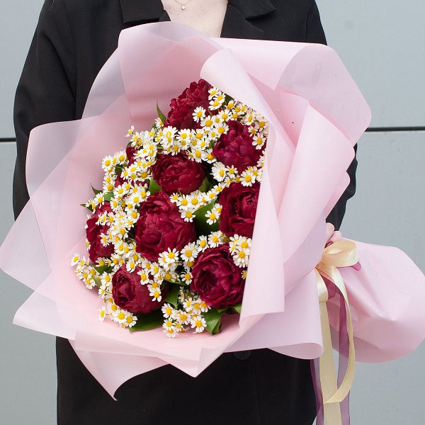 Букет из бордовых пионов и белых ромашек "Драгоценное мерло" - это уникальное сочетание цветов, которое станет отличным подарком для любого повода.