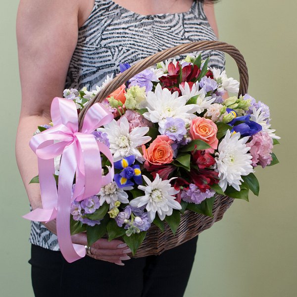 Корзинка из хризантем, роз, ирисов, альстромерий, маттиолы, лизиантуса с декоративной зеленью.