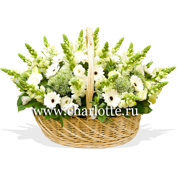 Корзина в бело-зеленой гамме из гербер, антиринумов, трахелиума, лизиантусов с декоративной зеленью. По Вашему желанию цветовую гамму корзины можно изменить, для этого звоните в наши салоны цветов или указывайте в разделе "комментарии для флориста" при заказе через интернет.