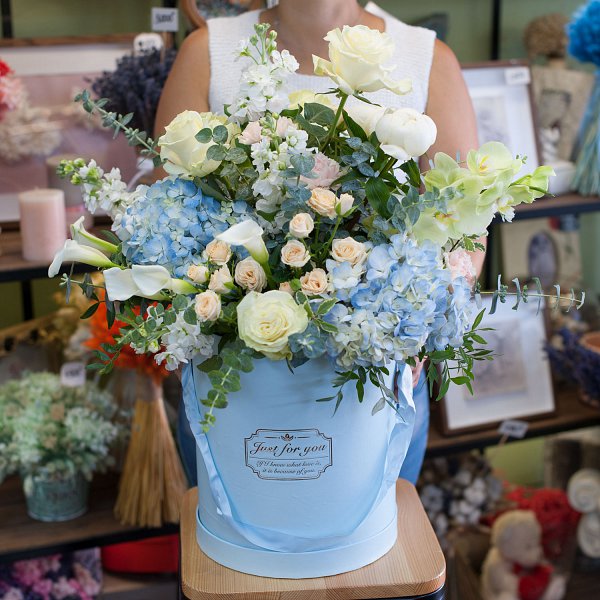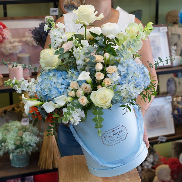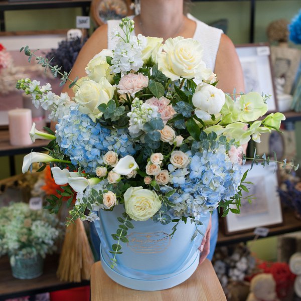 Коробка в бело-голубой гамме из гортензий, фаленопсисов, пионов, калл, кустовых роз, Маттиолы, гвоздик, эквадорских роз премиум класса с эвкалиптом и писташью.