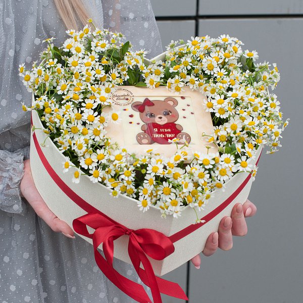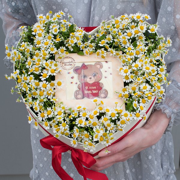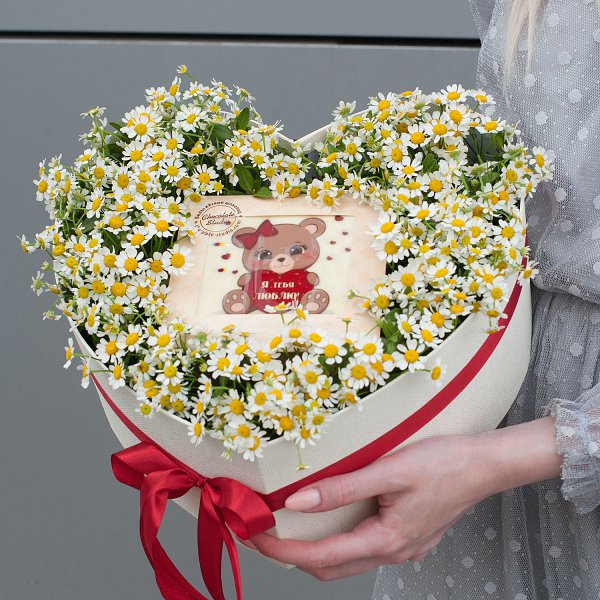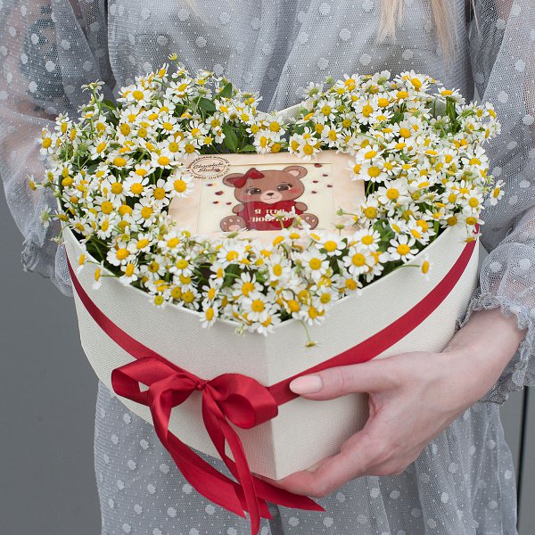 Композиция выполнена в виде коробки-сердца, что делает ее еще более привлекательной и запоминающейся. Внутри коробки находятся кустовые ромашки белого цвета, которые создают нежный и романтический образ.