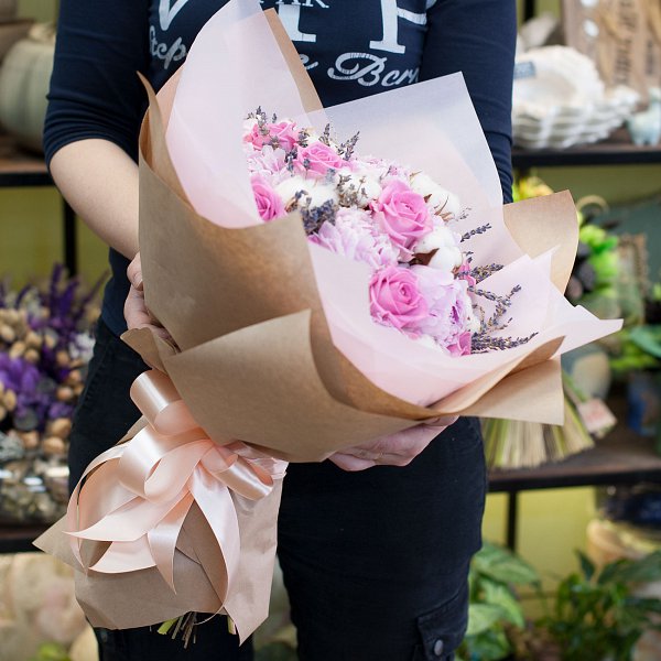 Букет выполнен в розовых тонах, что придает ему особую нежность и романтичность. В составе букета представлены розы Аква, розовые пионы, лаванда и хлопок. Такое сочетание цветов создает неповторимую композицию, которая будет радовать глаз и наполнять воздух приятным ароматом.