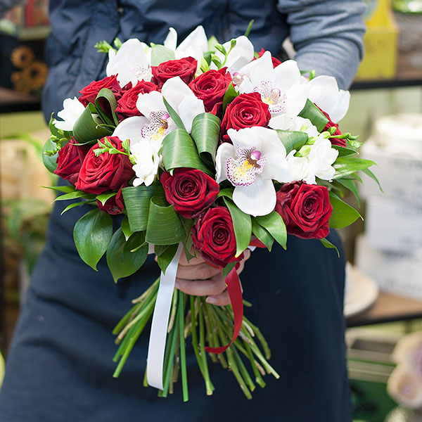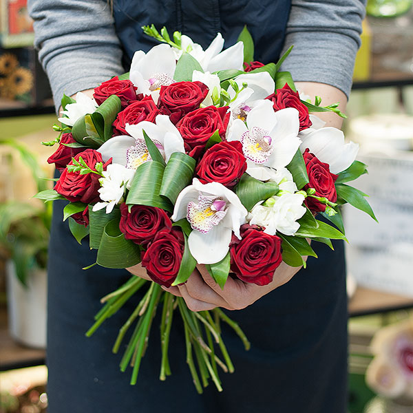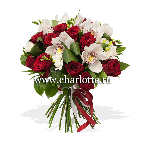 Букет на контрасте красного и белого из красных роз, белых орхидей цимбидиум, белых фрезий с декоративной зеленью и лентами. По Вашему желанию цветовую гамму букета можно изменить, для этого связывайтесь с нашими операторами по телефону или указывайте в "комментариях флористу через интернет".