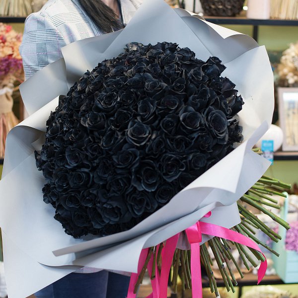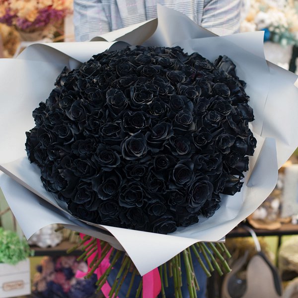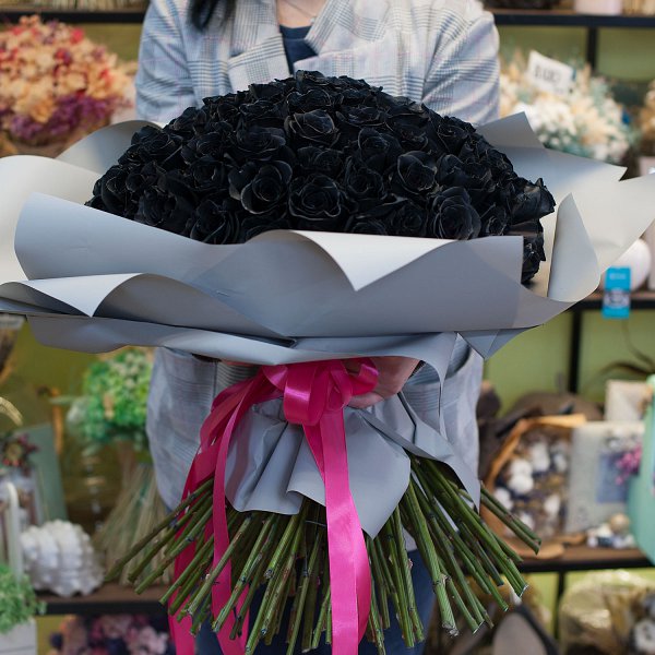 Большой букет из черных роз в дизайнерской упаковке.